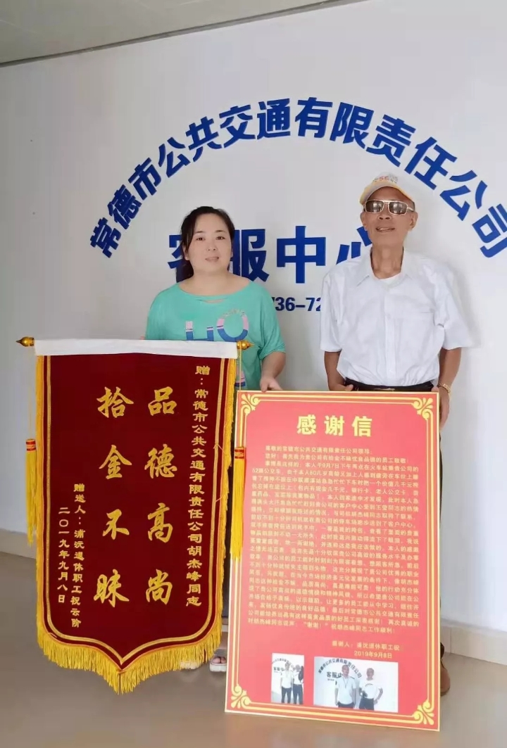 9月10日,浦沅退休職工祝大爺來到市公交公司客服中心,送上一面寫有“拾金不昧 品德高尚”的錦旗和感謝信,向52路公交車駕駛員胡杰峰表示感謝。