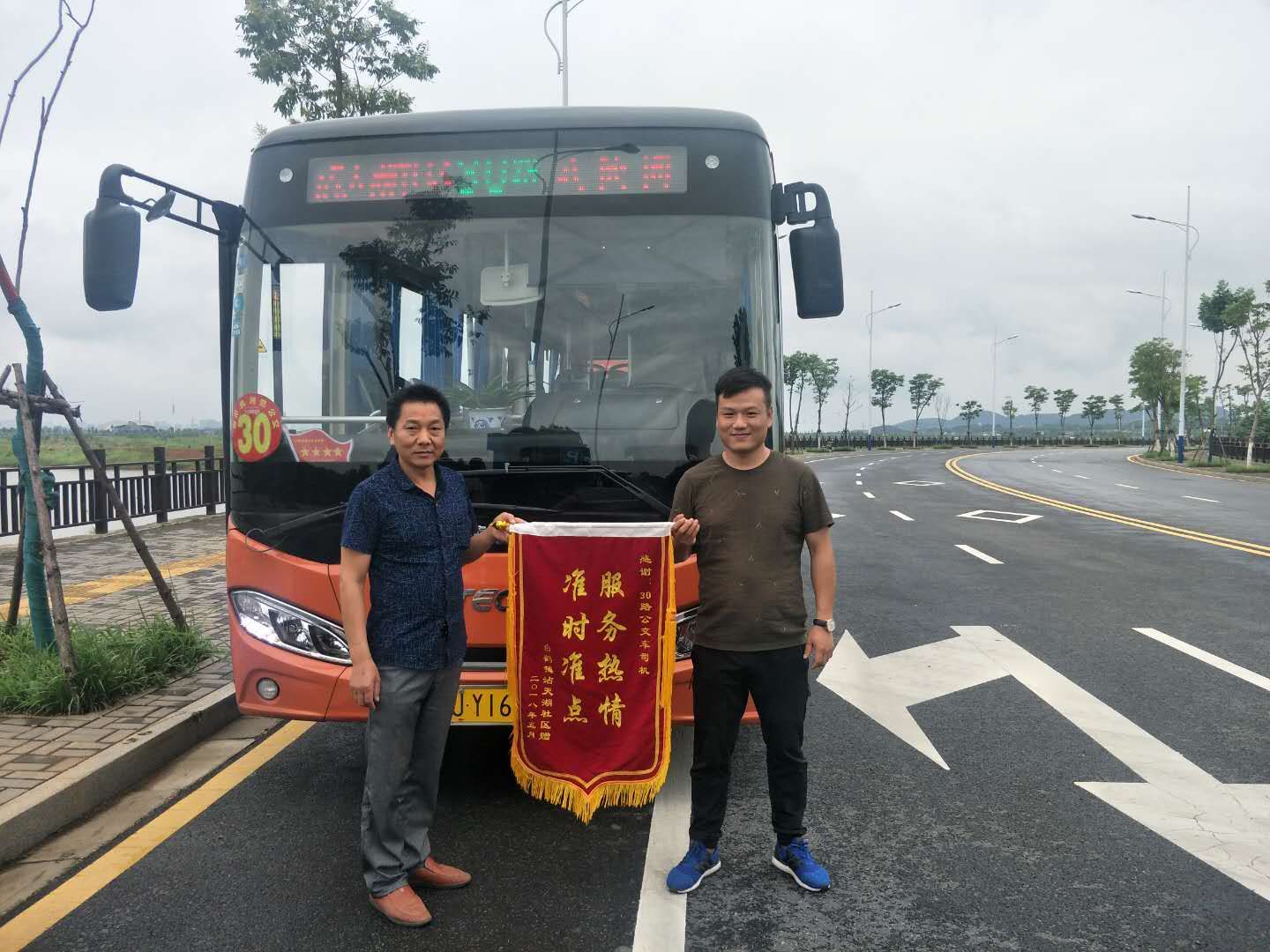 2018年5月22日,常德市柳葉湖旅游度假區(qū)白鶴鎮(zhèn)沾天湖社區(qū)主任顧佰平手捧著“準時準點,熱情服務(wù)”的錦旗來到常德公交30路線終點站——沾天湖社區(qū)站臺,親手將錦旗贈予30路線路隊長高曦,并感謝該線為保障沾天湖社區(qū)老百姓準時準點乘車出行所作的努力。