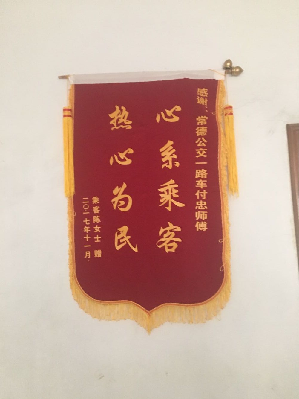 11月24日一大早,女乘客的兒子來到公司客服中心,親手為好心駕駛員付忠送來了感謝錦旗,并再三向付師傅表達(dá)了感謝之情。