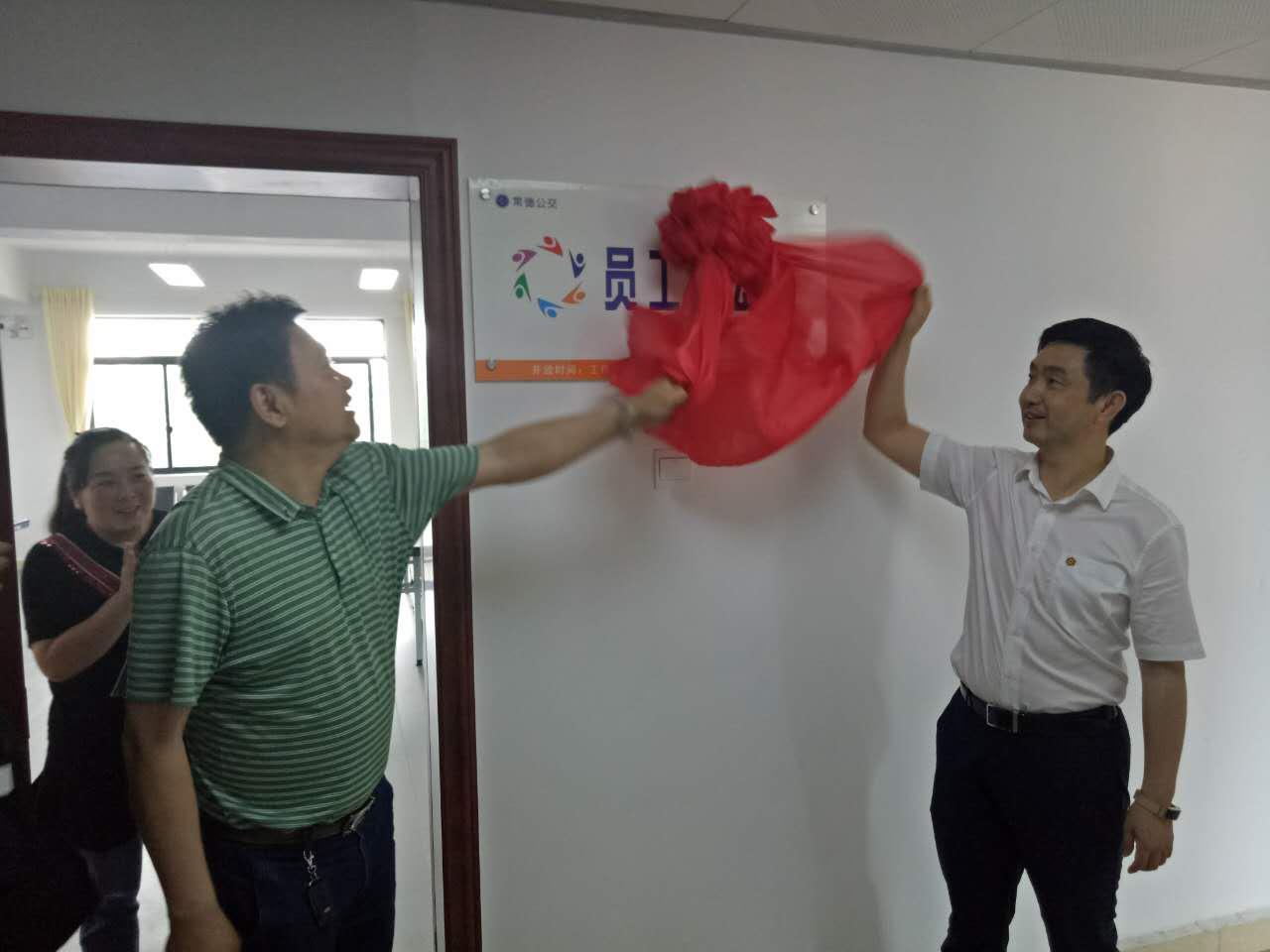 圖為公司董事長(zhǎng)沈小平(右)、總經(jīng)理胡安平(左二)正在活動(dòng)室揭牌
