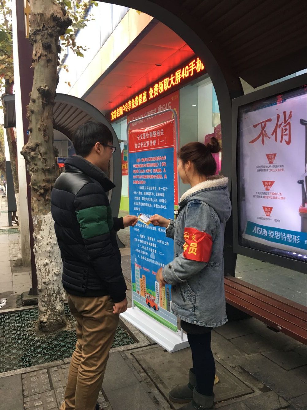 圖為公交青年志愿者正在向乘客發(fā)放宣傳資料