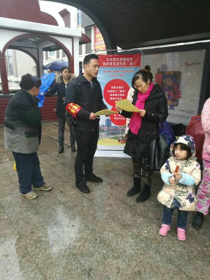 根據(jù)市發(fā)改委相關(guān)文件批復(fù),自2017年1月1日起,常德市城區(qū)實(shí)行新公交票價制度,市民乘坐公交車將不分季節(jié),統(tǒng)一實(shí)行全年一票制,票價為2元/人次(H5線除外),刷卡享受7.5折優(yōu)惠。為切實(shí)做好公交票價調(diào)整宣傳工作,市公交公司于2016年12月24日、25日,組織公司16名青年志愿者到城區(qū)客流較集中的市農(nóng)業(yè)局站、甘露寺站、下南門步步高站、朗州路郵電局站、公交總站、橋南市場東大門站及善卷路站7個站點(diǎn)開展了公交票價調(diào)整宣傳活動?;顒赢?dāng)天氣溫寒冷,凍雨不斷,但是志愿者卻不畏嚴(yán)寒,不怕辛苦,認(rèn)真在各自分管的站點(diǎn)積極向過往市民發(fā)放相關(guān)宣傳資料,并面對面為市民耐心宣講公交票價調(diào)整、辦卡網(wǎng)點(diǎn)、優(yōu)惠乘車及臨時公交卡購買、使用等相關(guān)知識?;顒蝇F(xiàn)場人潮涌動,熱鬧非凡,吸引了廣大市民駐足詢問,大部分市民對公交票價調(diào)整表示理解與支持,同時也希望公交公司能提供更加貼心、優(yōu)質(zhì)的乘車服務(wù)。據(jù)悉,為增進(jìn)此次宣傳活動效果,市公交公司還將于元月1日至5日,在市城區(qū)各站點(diǎn)跟進(jìn)開展站臺服務(wù)活動。